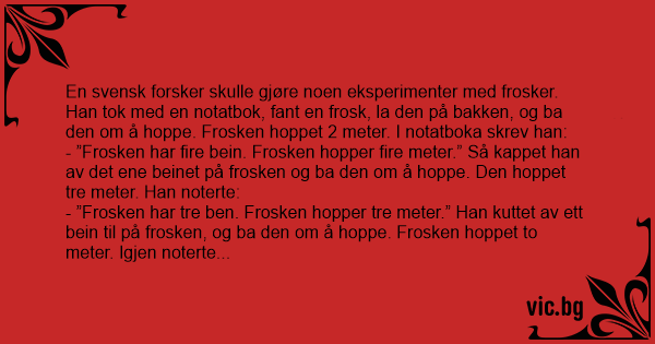 En svensk forsker skulle gjøre noen eksperimenter med frosker. Han tok med en notatbok, fant en frosk, la den på bakken, og ba den om å hoppe. Frosken hoppet 2 meter. I notatboka skrev han: