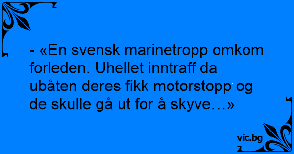 - «En svensk marinetropp omkom forleden. Uhellet inntraff da ubåten deres fikk motorstopp og de skulle gå ut for å skyve…»