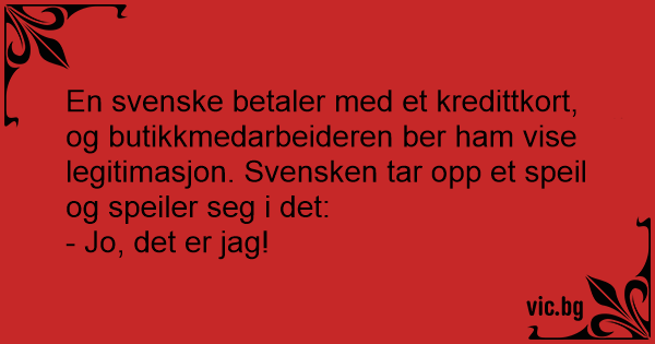 En svenske betaler med et kredittkort, og butikkmedarbeideren ber ham vise legitimasjon. Svensken tar opp et speil og speiler seg i det: