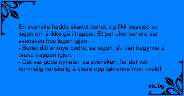 En svenske hadde skadet benet, og fikk beskjed av legen om å ikke gå i trapper. Et par uker senere var svensken hos legen igjen.