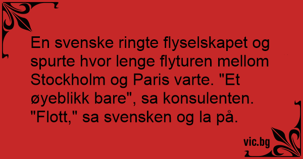 En svenske ringte til skranken i SAS og spurte: - Hvor lang tid tar det å fly herfra til London? - Et øyeblikk, svarte damen i skranken. – Mange takk, svarte svensken og la på.