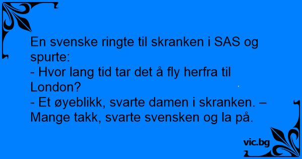 En svenske ringte flyselskapet og spurte hvor lenge flyturen mellom Stockholm og Paris varte. "Et øyeblikk bare", sa konsulenten. "Flott," sa svensken og la på.
