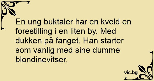 En ung buktaler har en kveld en forestilling i en liten by. Med dukken på fanget. Han starter som vanlig med sine duмме blondinevitser.