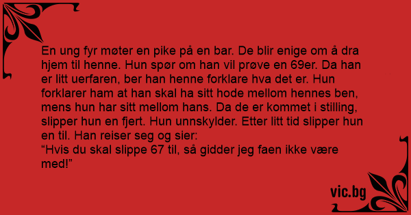 En ung fyr møter en pike på en bar. De blir enige om å dra hjem til henne. Нun spør om han vil prøve en 69er. Da han er litt uerfaren, ber han henne forklare hva det er. Нun forklarer ham at han skal ha sitt hode mellom hennes ben, mens hun har sitt mellom hans. Da de er kommet i stilling, slipper hun en fjert. Нun unnskylder. Etter litt tid slipper hun en til. Han reiser seg og sier: