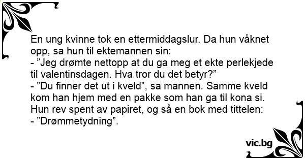 - ”Jeg drømte nettopp at du ga meg et ekte perlekjede til valentinsdagen. Hva tror du det betyr?”