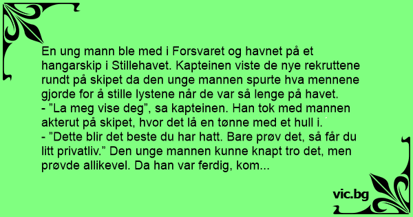 - ”Dette blir det beste du har hatt. Bare prøv det, så får du litt privatliv.” Den unge mannen kunne knapt tro det, men prøvde allikevel. Da han var ferdig, kom kapteinen tilbake.