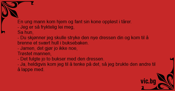 - Du skjønner jeg skulle stryke den nye dressen din og kom til å brenne et svært hull i buksebaken.