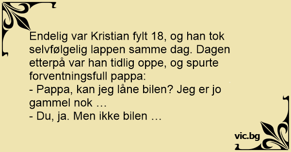 Endelig var Kristian fylt 18, og han tok selvfølgelig lappen samme dag. Dagen etterpå var han tidlig oppe, og spurte forventningsfull pappa: