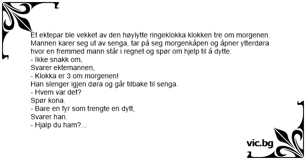 Et ektepar ble vekket av den høylytte ringeklokka klokken tre om morgenen. Mannen karer seg ut av senga, tar på seg morgenkåpen og åpner ytterdøra hvor en fremmed mann står i regnet og spør om hjelp til å dytte.