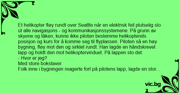 Et helikopter fløy rundt over Seattle når en elektrisk feil plutselig slo ut alle navigasjons - og kommunikasjonssystemene. På grunn av skyene og tåken, kunne ikke piloten bestemme helikopterets posisjon og kurs for å komme seg til flyplassen. Piloten så en høy bygning, fløy mot den og sirklet rundt. Han lagde en håndskrevet lapp og holdt den mot helikoptervinduet. På lappen sto det: - Hvor er jeg? Med store bokstaver. Folk inne i bygningen reagerte fort på pilotens lapp, lagde en stor plakat og viste den ut mot piloten. På den sto det. - DU ER I ET HELIKOPTER! Piloten smilte, vinket, så på kartet sitt og fant kursen for å fly til SEATEC airport , og landet trygt. Etter at de landet lurte andrepiloten på hvordan skiltet med - - DU ER I ET HELIKOPTER! Hadde hjulpet han med å finne veien til flyplassen,svarte han: - Jeg skjønte det måtte være Microsoft-bygningen, for de ga meg et teknisk riktig, men fullstendig ubrukelig svar.