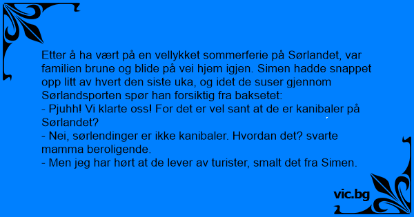 - Pjuhh! Vi klarte oss! For det er vel sant at de er kanibaler på Sørlandet?