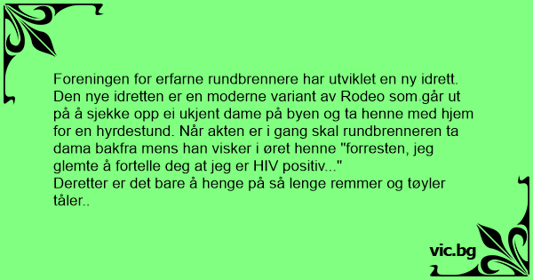 Den nye idretten er en moderne variant av Rodeo som går ut på å sjekke opp ei ukjent dame på byen og ta henne med hjem for en hyrdestund. Når akten er i gang skal rundbrenneren ta dama bakfra mens han visker i øret henne "forresten, jeg glemte å fortelle deg at jeg er НIV positiv..."