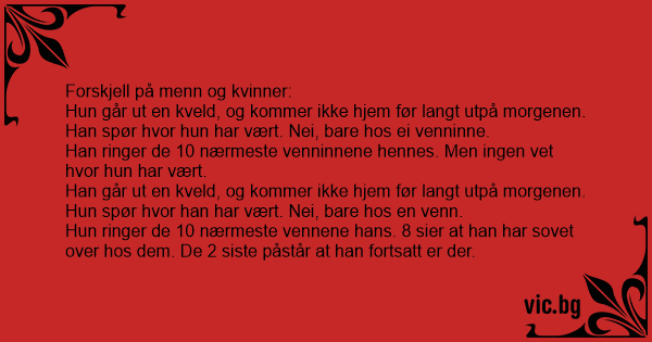 Hun går ut en kveld, og kommer ikke hjem før langt utpå morgenen. Han spør hvor hun har vært. Nei, bare hos ei venninne.