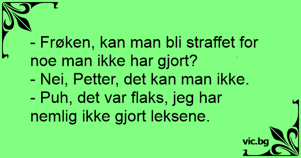 Η ΜΑΘΗΤΡΙΑ ΣΤΗΝ ΔΑΣΚΑΛΑ Η τιμωρία..... - Кажи Иванчо? Учителката само што влегува на час, а Зоки Поки веднаш крева рака. Иванчо към учителката: Little Johnny asks the teacher, “Mrs Roberts, can I be punished for something I haven’t done?” Student: "would you ever punish me for something I didn't do?" Toto se plaint à un ami, Pierino: "Signora maestra si puo' punire uno per una cosa che non ha fatto?". Un alunno di 5° elementare si alza in piedi non appena entra la maestra e le chiede: One day a boy came home running while crying. "Herr Lehrer," fragt Fritzchen den Klassenlehrer. "kann man für etwas bestraft werden, was man nicht getan hat?" PUPIL: "Would you punish me for something I did not do?" TEACHER:" Of course not." PUPIL: "Good, because I haven't done my homework." "Kann man für etwas bestraft werden was man gar nicht gemacht hat?", fragt Fritz den Lehrer. Lehrer antwortet: "Nein kann man nicht." Fritz: "Gut, ich hab nämlich meine Hausaufgabe nicht gemacht!" C'est une conversation entre une maîtresse d'école et Toto : Toto : - Madame, madame, est-ce que je peux être puni pour quelque chose que je n'ai pas fait ? La maîtresse : - Mais bien sur que non Toto, on ne va pas te punir pour quelque chose que tu n'as pas fait. Toto : - Eh bien, ça va alors...... Sınıfa yeni gelen öğrenci ikinci gün öğretmenine sorar " Öğretmenim insana yapmadığı bir şey için ceza verir misiniz ?" Öğretmeni "olur mu öyle şey evladım neden insana yapmadığı bir şey için ceza... Ma mère m'a puni pour une chose que je n'ai même pas faite. - Ah oui ! Pour quoi ? - Mes devoirs. Girl: “Mommy, today in school I was punished for something that I didn’t do.” Mother: “But that’s terrible! I’m going to have a talk with your teacher about this … by the way, what was it that you... - Fröken kan man få skäll för något man inte har gjort? - Nej, varför undrar du det Pelle? - Jag har inte gjort läxan! Det var en pojke som frågade sin fröken: - Fröken, kan man få skäll för nåt man inte har gort? - Nej, sa fröken. - Bra, för jag har inte gjort läxan!!! Joãozinho chega para a professora e pergunta: — Professora, alguém pode ser culpado por alguma coisa que não fez? — Mas é claro que não, Joãozinho! — Ufa! Eu não fiz o dever de casa. Jantje zat in de klas en vroeg aan de meester: "Meester, word je gestraft voor iets dat je niet gedaan hebt?" Waarop de meester antwoordde: "Natuurlijk niet Jantje, als je niets gedaan hebt, waarom... Hr. lærer, man må ikke straffe nogen, der ikke har lavet noget, vel, hr. lærer? Selvfølgelig ikke, Brian. Hvorfor kommer du dog på det? For jeg har ikke lavet min regneopgave! Toto arrive gentillement et dit à sa maitresse: - Est ce qu'on peut punir une personne pour quelque chose qu'il na pas fait madame? - Ho non pas dutout c'est de l'injustice, c'est de la mechanceté... Na začátku hodiny se přihlásil Pepíček: „Paní učitelko, mohu být potrestán za něco, co jsem neudělal?” „No, to v žádném případě, Pepíčku.” „Tak to mi spadl kámen ze srdce - já jsem totiž neudělal... - Apu, meg lehet büntetni valakit azért, amit nem csinált? - Nem, kisfiam. Mit nem csináltál? - Házi feladatot... En el colegio: - Señorita profesora, ¿verdad que no se debe castigar a un niño por una cosa que no haya hecho? - No, claro que no. - Estupendo, no he hecho los deberes. Toto demande à se maîtresse : - Madame ! Est-ce que c'est normal si je suis puni pour quelque chose que je n'ai pas fait ? - Bien sûr que non ! On ne peut pas te punir pour quelque chose que n'as... Ali o günkü derslerini hazırlamamıştı. Sınıfa öğretmenin girdiğini görünce parmağını kaldırır ve: - Öğretmenim bir insana yapmadığı bir şey için ceza verilir mi? - Verilmez oğlum. - O halde ben... Eleven till läraren: - Kan man få skäll för något man inte gjort ? Läraren: - Nej. Eleven: - Bra, för jag har inte gjort läxan ! Jantje vraagt aan de leraar: "Meneer, kan iemand ook gestraft worden voor iets wat dat hij niet gedaan heeft?" Leraar: "Nee, dat is niet eerlijk. Maar waarom vraag je dat?" Jantje: "Ik heb mijn... PepitO le dice a su profesora: Profe usted me castigaria por algo q yo nom ice...?¿ Y la profesora, con sierta risa le dice: No Pepito como crees que te voy a castigar por algo que no iciste... Y... Llega pepito a donde su maestra: - Maestra, ¿usted castigaria a un niño que no ha hecho nada? - Pues, no, no tendria porque hacerlo. ¿Pero porque preguntas Pepito? - Por nada, ahora sencillamente... Küçük kız okuldan gelir ve annesine: - Annecim,bugün okulda yapmadığım bir şey yüzünden cezalandırıldım. Annesi yüksek sesle: - Ama, bu nasıl olur? Okula gelip öğretmeninle bu konu hakkında...
