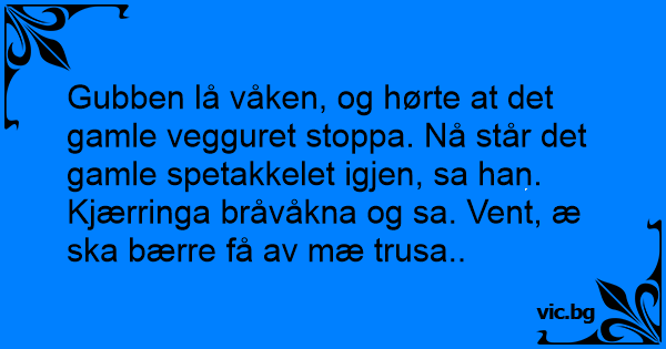 Gubben lå våken, og hørte at det gamle vegguret stoppa. Nå står det gamle spetakkelet igjen, sa han. Kjærringa bråvåkna og sa. Vent, æ ska bærre få av mæ trusa..