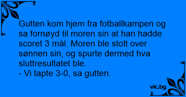 Gutten kom hjem fra fotballkampen og sa fornøyd til moren sin at han hadde scoret 3 mål. Moren ble stolt over sønnen sin, og spurte dermed hva sluttresultatet ble.