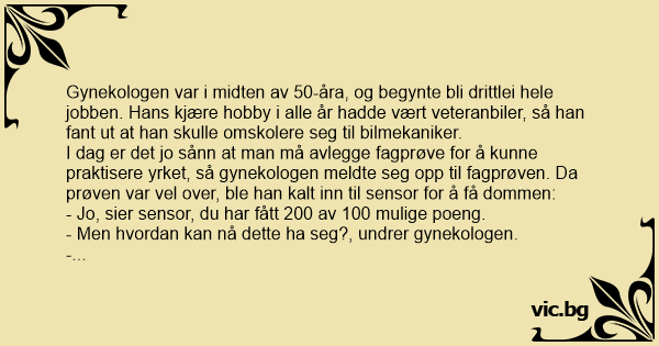 I dag er det jo sånn at man må avlegge fagprøve for å kunne praktisere yrket, så gynekologen meldte seg opp til fagprøven. Da prøven var vel over, ble han kalt inn til sensor for å få dommen: