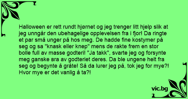 Halloween er rett rundt hjørnet og jeg trenger litt hjelp slik at jeg unngår den ubehagelige opplevelsen fra i fjor! Da ringte et par små unger på hos meg. De hadde fine kostymer på seg og sa "knask eller knep" mens de rakte frem en stor bolle full av masse godteri! "Ja takk", svarte jeg og forsynte meg ganske вrа av godteriet deres. Da ble ungene helt fra seg og begynte å gråte! Så da lurer jeg på, tok jeg for mye?! Hvor mye er det vanlig å ta?!