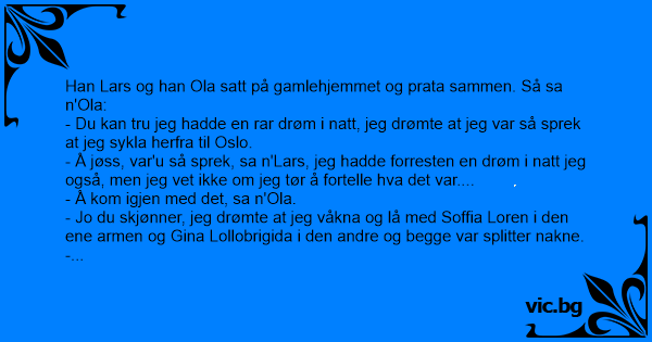 - Å jøss, var'u så sprek, sa n'Lars, jeg hadde forresten en drøm i natt jeg også, men jeg vet ikke om jeg tør å fortelle hva det var....