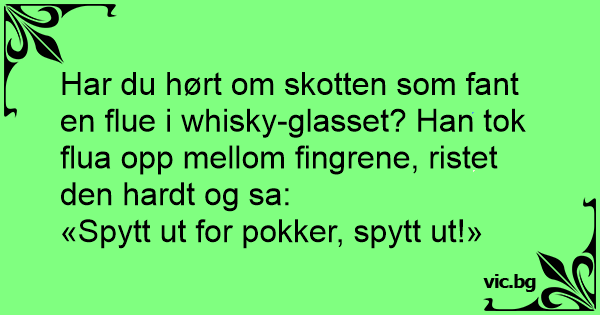 Har du hørt om skotten som fant en flue i whisky-glasset? Han tok flua opp mellom fingrene, ristet den hardt og sa: