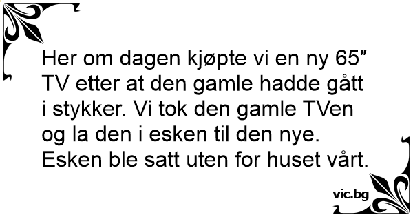 Her om dagen kjøpte vi en ny 65″ TV etter at den gamle hadde gått i stykker. Vi tok den gamle TVen og la den i esken til den nye. Esken ble satt uten for huset vårt.