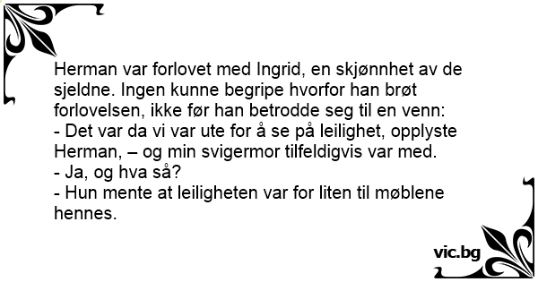 - Det var da vi var ute for å se på leilighet, opplyste Herman, – og min svigermor tilfeldigvis var med.