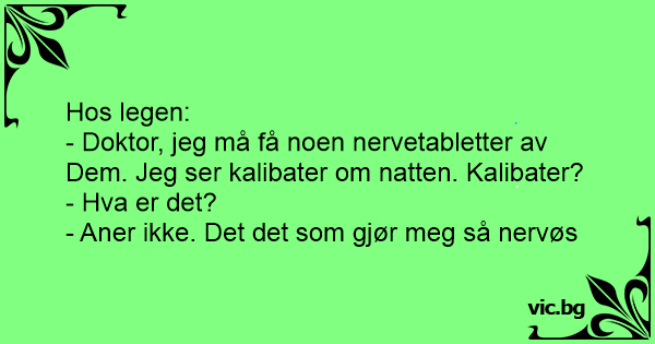 - Doktor, jeg må få noen nervetabletter av Dem. Jeg ser kalibater om natten. Kalibater?