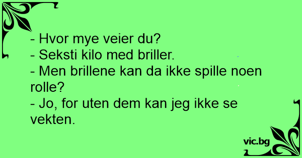 Hvor meget vejer du? – 85 kilo med briller – Hvad vejer du så uden? – Det ved jeg ikke – Det kan jeg ikke se