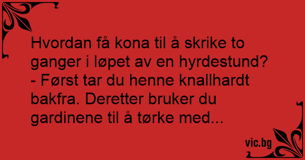 Skrig for mig Hvordan for man en kvinde til at skrige to gange? – Først boller man hende i røven og bagefter tørre man den af i hendes gardin