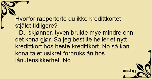 - Du skjønner, tyven brukte mye mindre enn det kona gjør. Så jeg bestilte heller et nytt kredittkort hos beste-kredittkort. No så kan kona ta et usikret forbrukslån hos lånutensikkerhet. No.