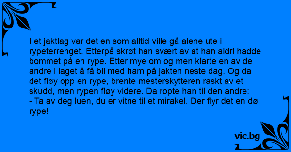 I et jaktlag var det en som alltid ville gå alene ute i rypeterrenget. Etterpå skrøt han svært av at han aldri hadde bommet på en rype. Etter mye om og men klarte en av de andre i laget å få bli med ham på jakten neste dag. Og da det fløy opp en rype, brente mesterskytteren raskt av et skudd, men rypen fløy videre. Da ropte han til den andre: