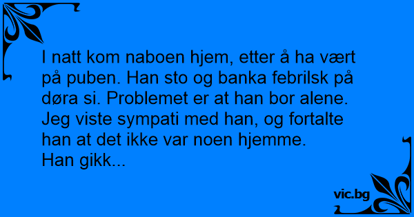 I natt kom naboen hjem, etter å ha vært på puben. Han sto og banka febrilsk på døra si. Problemet er at han bor alene. Jeg viste sympati med han, og fortalte han at det ikke var noen hjemme.