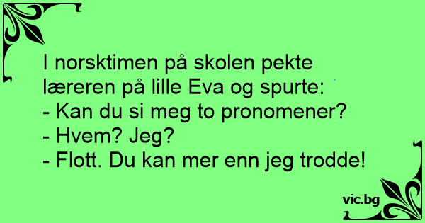 Læreren: – Si to pronomen. Gutten: – Hvem, jeg? Læreren: – Det er helt riktig.