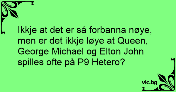 Ikkje at det er så forbanna nøye, men er det ikkje løye at Queen, George Michael og Elton John spilles ofte på P9 Hetero?