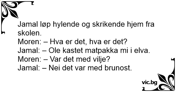 Jamal løp hylende og skrikende hjem fra skolen. Moren: – Hva er det, hva er det? Jamal: – Ole kastet matpakka mi i elva. Moren: – Var det med vilje? Jamal: – Nei det var med brunost.