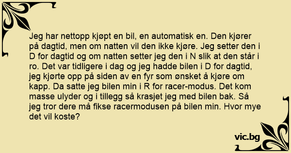 Jeg har nettopp kjøpt en bil, en automatisk en. Den kjører på dagtid, men om natten vil den ikke kjøre. Jeg setter den i D for dagtid og om natten setter jeg den i N slik at den står i ro. Det var tidligere i dag og jeg hadde bilen i D for dagtid, jeg kjørte opp på siden av en fyr som ønsket å kjøre om kapp. Da satte jeg bilen min i R for racer-modus. Det kom masse ulyder og i tillegg så krasjet jeg med bilen bak. Så jeg tror dere må fikse racermodusen på bilen min. Hvor mye det vil koste?