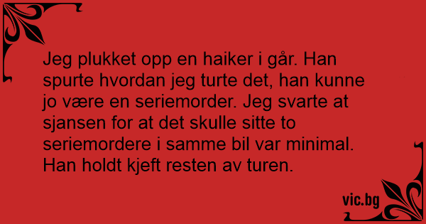 Jeg plukket opp en haiker i går. Han spurte hvordan jeg turte det, han kunne jo være en seriemorder. Jeg svarte at sjansen for at det skulle sitte to seriemordere i samme bil var minimal. Han holdt kjeft resten av turen.