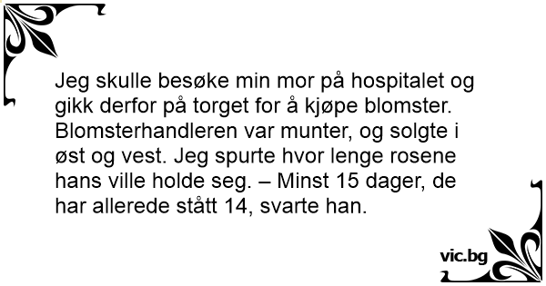 Jeg skulle besøke min mor på hospitalet og gikk derfor på torget for å kjøpe blomster. Blomsterhandleren var мunтеr, og solgte i øst og vest. Jeg spurte hvor lenge rosene hans ville holde seg. – Minst 15 dager, de har allerede stått 14, svarte han.