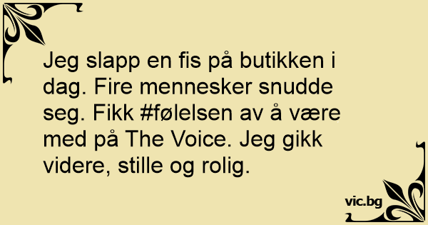 Jeg slapp en fis på butikken i dag. Fire mennesker snudde seg. Fikk #følelsen av å være med på The Voice. Jeg gikk videre, stille og rolig.