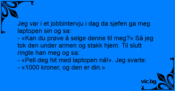 I was in a job interview today when the manager handed me his laptop and said, “I want you to try and sell this to me.” So I put it under my arm, walked out of the building and went home....