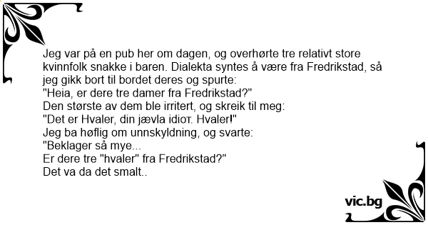 Jeg var på en pub her om dagen, og overhørte tre relativt store kvinnfolk snakke i baren. Dialekta syntes å være fra Fredrikstad, så jeg gikk bort til bordet deres og spurte: