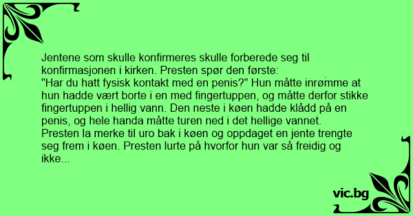 Konfirmationen Pigerne i 7 klasse skulle forberede sig på konfirmationen inde i kirken. Præsten spørger den første: Har du haft fysisk kontakt med en penis? Hun havde taget på en med fingeren, og...