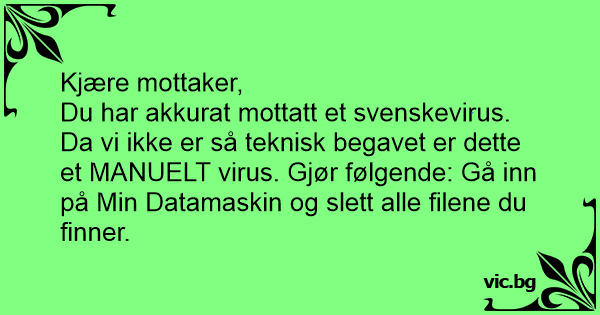 Du har akkurat mottatt et svenskevirus. Da vi ikke er så teknisk begavet er dette et MANUELT virus. Gjør følgende: Gå inn på Min Datamaskin og slett alle filene du finner.