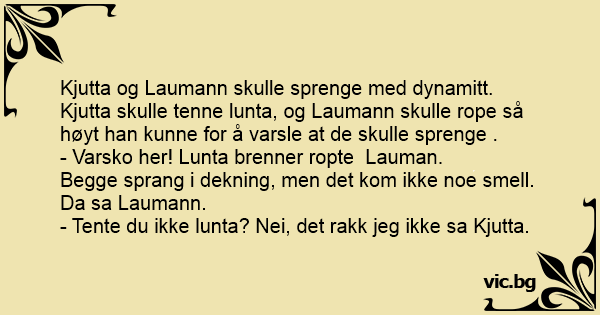 Kjutta og Laumann skulle sprenge med dynamitt. Kjutta skulle tenne lunta, og Laumann skulle rope så høyt han kunne for å varsle at de skulle sprenge .