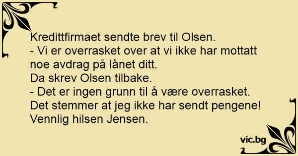 - Det er ingen grunn til å være overrasket. Det stemmer at jeg ikke har sendt pengene! Vennlig hilsen Jensen.