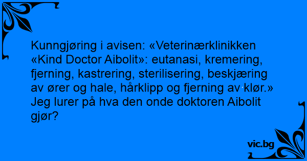 Kunngjøring i avisen: «Veterinærklinikken «Kind Doctor Aibolit»: eutanasi, kremering, fjerning, kastrering, sterilisering, beskjæring av ører og hale, hårklipp og fjerning av klør.»