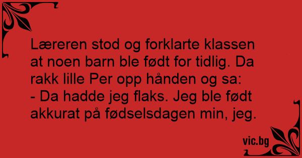 Læreren stod og forklarte klassen at noen barn ble født for tidlig. Da rakk lille Per opp hånden og sa: