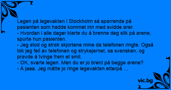 Hos lægen. "Hvordan kunne du brænde ørene?" "Jeg stod og strøg tøj, da telefonen pludselig ringede. Og så tog jeg fejl af telefonen og strygejernet!" "Men du har jo brændt begge øre..." "Ja, jeg...