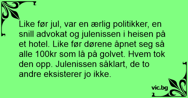Like før jul, var en ærlig politikker, en snill advokat og julenissen i heisen på et hotel. Like før dørene åpnet seg så alle 100kr som lå på golvet. Hvem tok den opp. Julenissen såklart, de to andre eksisterer jo ikke.