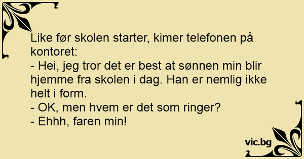 Eleven ringer til skolen en morgen: – Jeg tror det er best sønnen min blir hjemme idag. Han er ikke riktig frisk. – Ja vel, hvem er det som ringer. – Det er faren min.